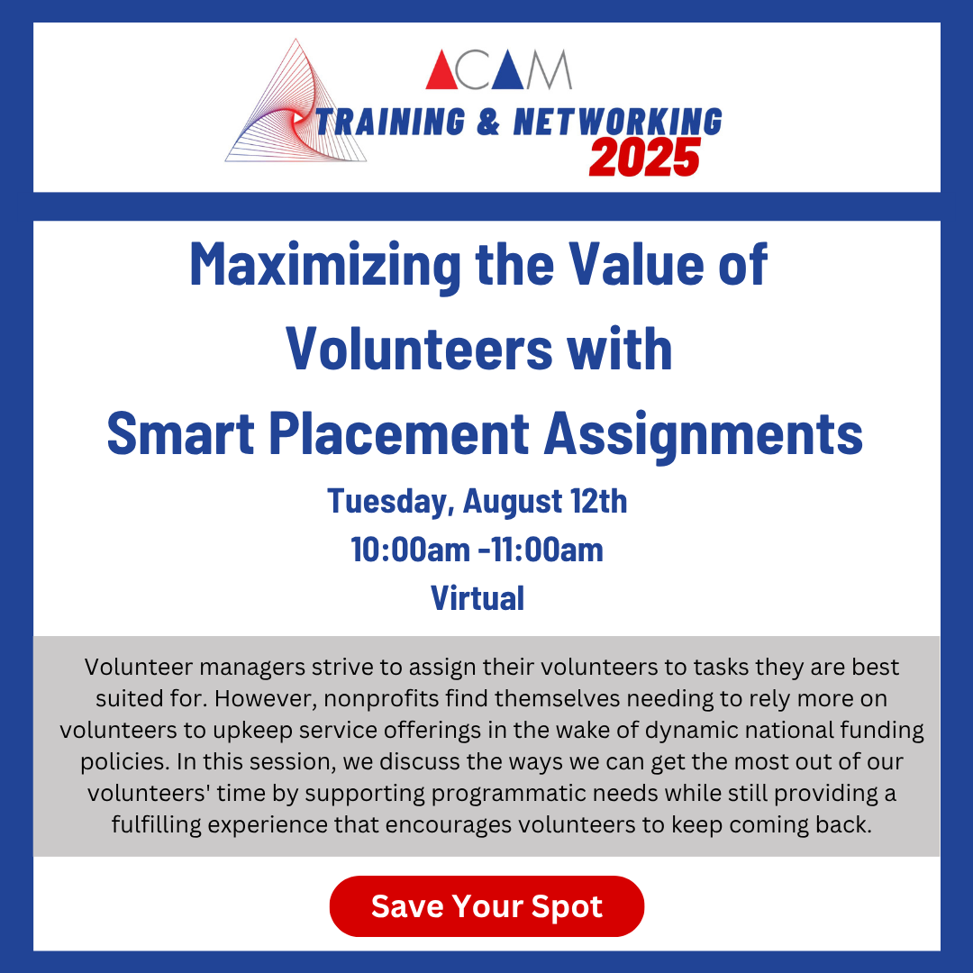 Volunteer managers strive to assign their volunteers to tasks they are best suited for. However, nonprofits find themselves needing to rely more on volunteers to upkeep service offerings in the wake of dynamic national funding policies. In this session, we discuss the ways we can get the most out of our volunteers' time by supporting programmatic needs while still providing a fulfilling experience that encourages volunteers to keep coming back.